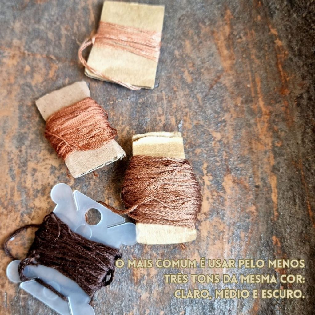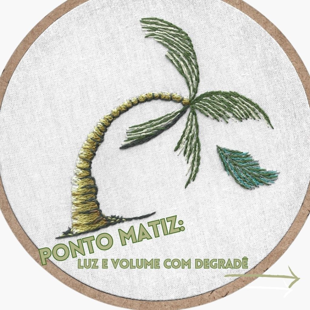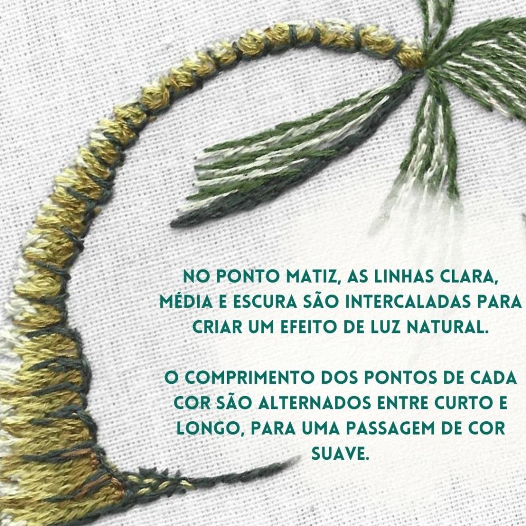 Ponto base da pintura de agulha, no Ponto Matiz as formas são criadas com volume e luminosidade realista por meio de linhas com degradê de cores.
