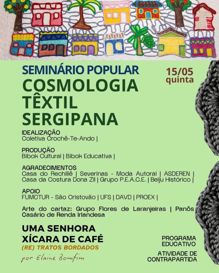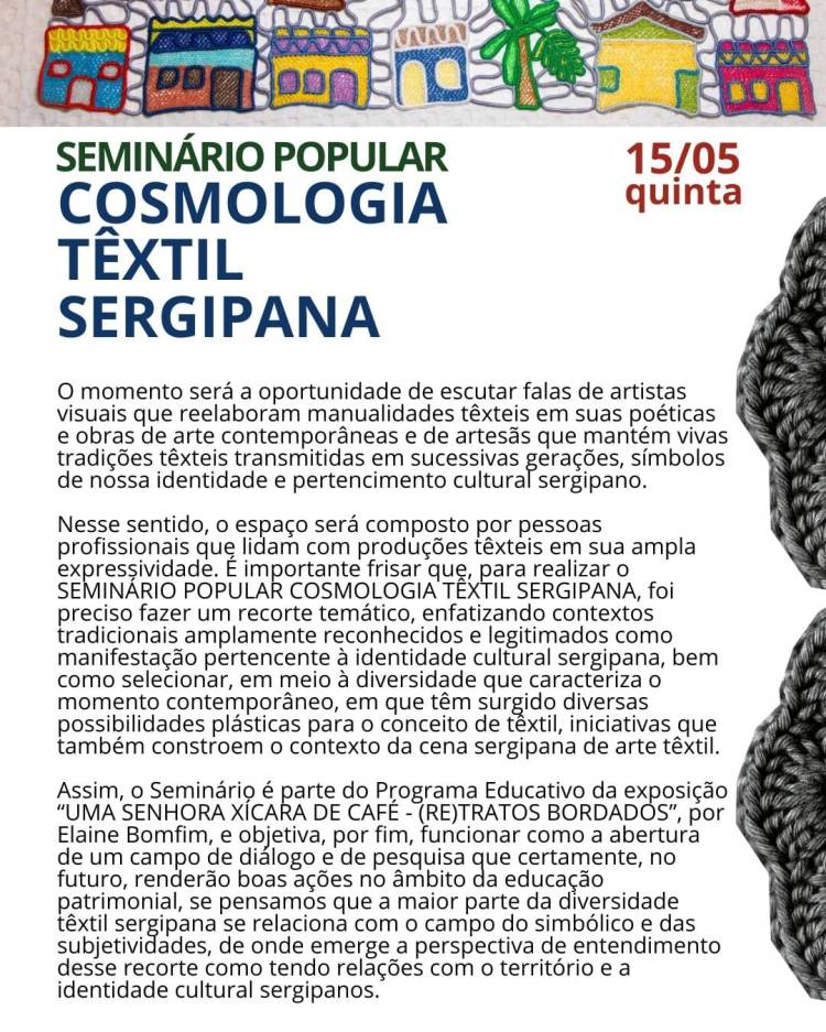 Assim, o Seminário é parte do Programa Educativo da exposição “UMA SENHORA XÍCARA DE CAFÉ – (RE)TRATOS BORDADOS”, por Elaine Bomfim, e objetiva, por fim, funcionar como a abertura de um campo de diálogo e de pesquisa que certamente, no futuro, renderão boas ações no âmbito da educação patrimonial, se pensamos que a maior parte da diversidade têxtil sergipana se relaciona com o campo do simbólico e das subjetividades, de onde emerge a perspectiva de entendimento desse recorte como tendo relações com o território e a identidade cultural sergipanos.