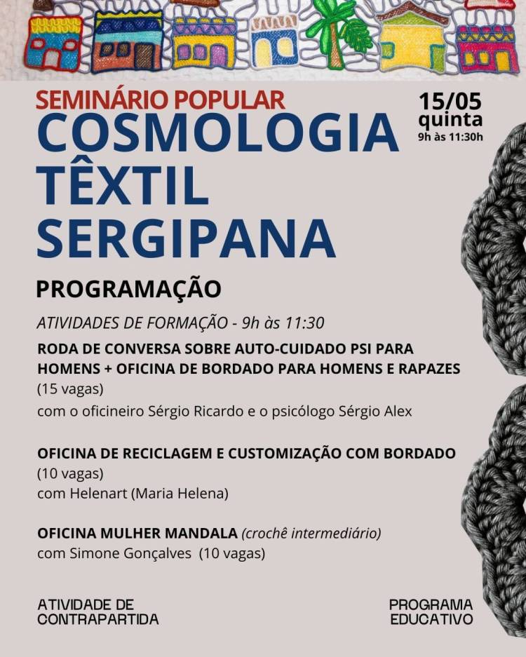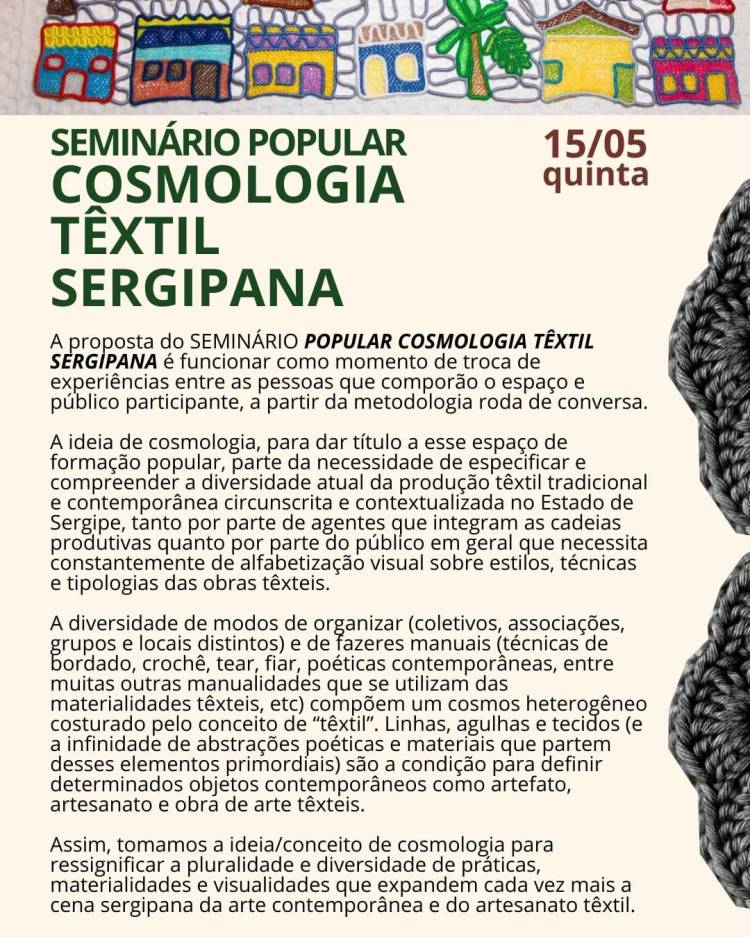 A proposta do SEMINÁRIO POPULAR COSMOLOGIA TÊXTIL SERGIPANA é funcionar como momento de troca de experiências entre as pessoas que comporão o espaço e público participante, a partir da metodologia roda de conversa.