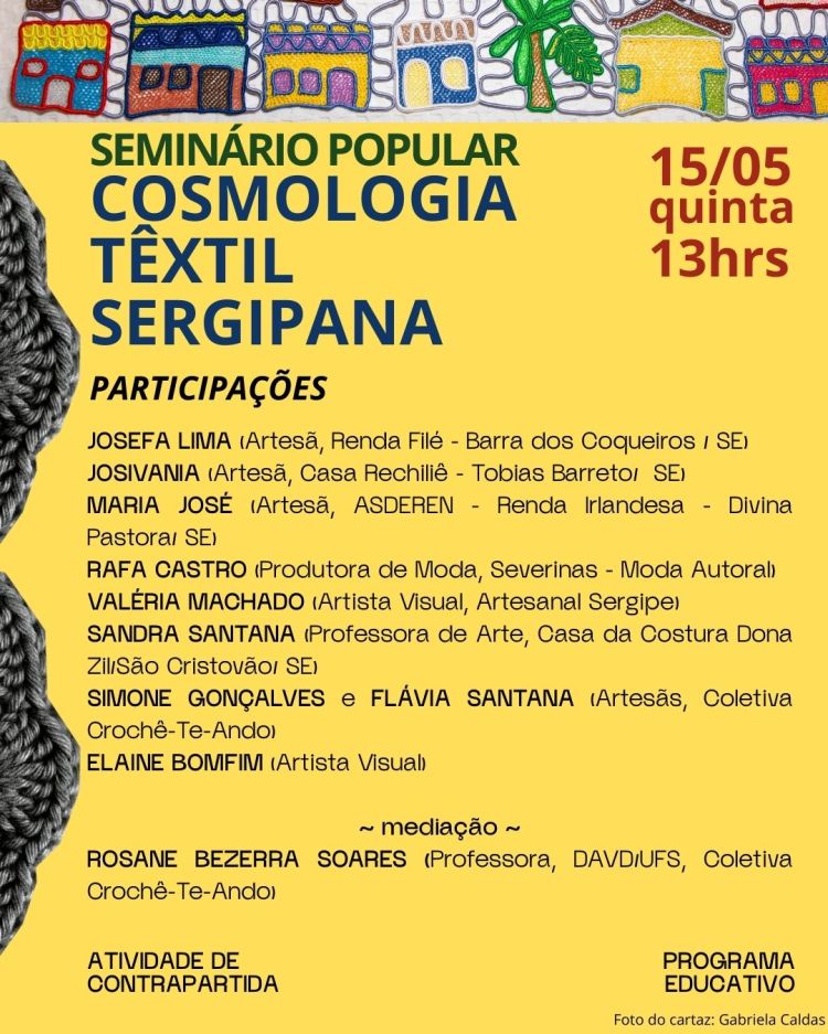 Assim, tomamos a ideia/conceito de cosmologia para ressignificar a pluralidade e diversidade de práticas, materialidades e visualidades que expandem cada vez mais a cena sergipana da arte contemporânea e do artesanato têxtil. O momento será a oportunidade de escutar falas de artistas visuais que reelaboram manualidades têxteis em suas poéticas e obras de arte contemporâneas e de artesãs que mantém vivas tradições têxteis transmitidas em sucessivas gerações, símbolos de nossa identidade e pertencimento cultural sergipano.