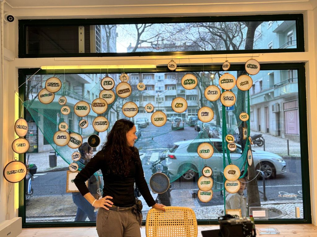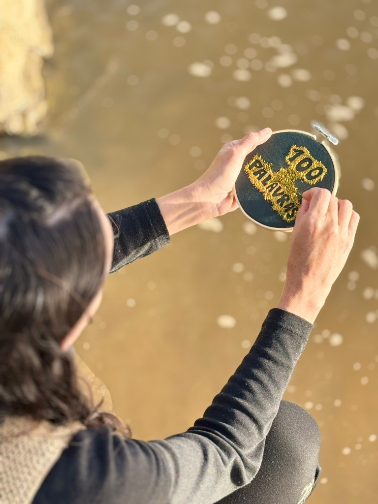Instalação com vídeo performance e poema com 100 palavras bordadas em 100 bastidores. Rio Sergipe – Rio Tejo. Brasil | Portugal. 2026.