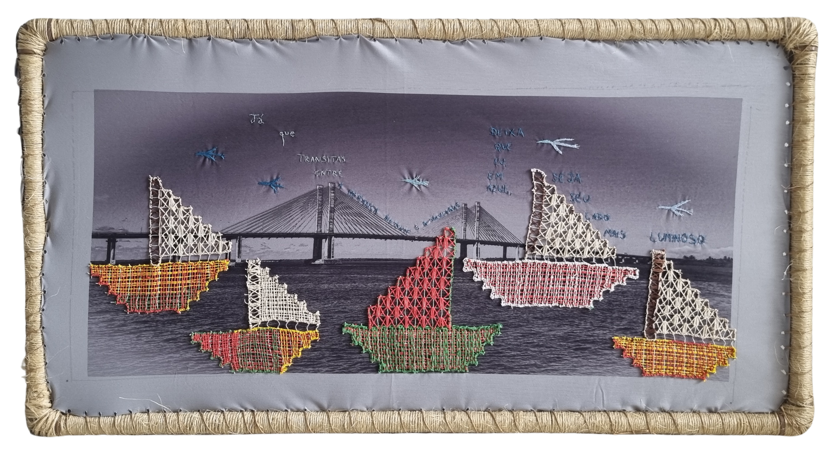 Em trânsito. 100 cm x 50 cm. Bordado contemporâneo com aplicação de renda filé de Andreia Santos. 2022.