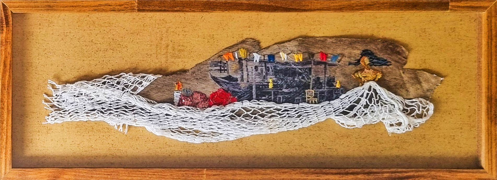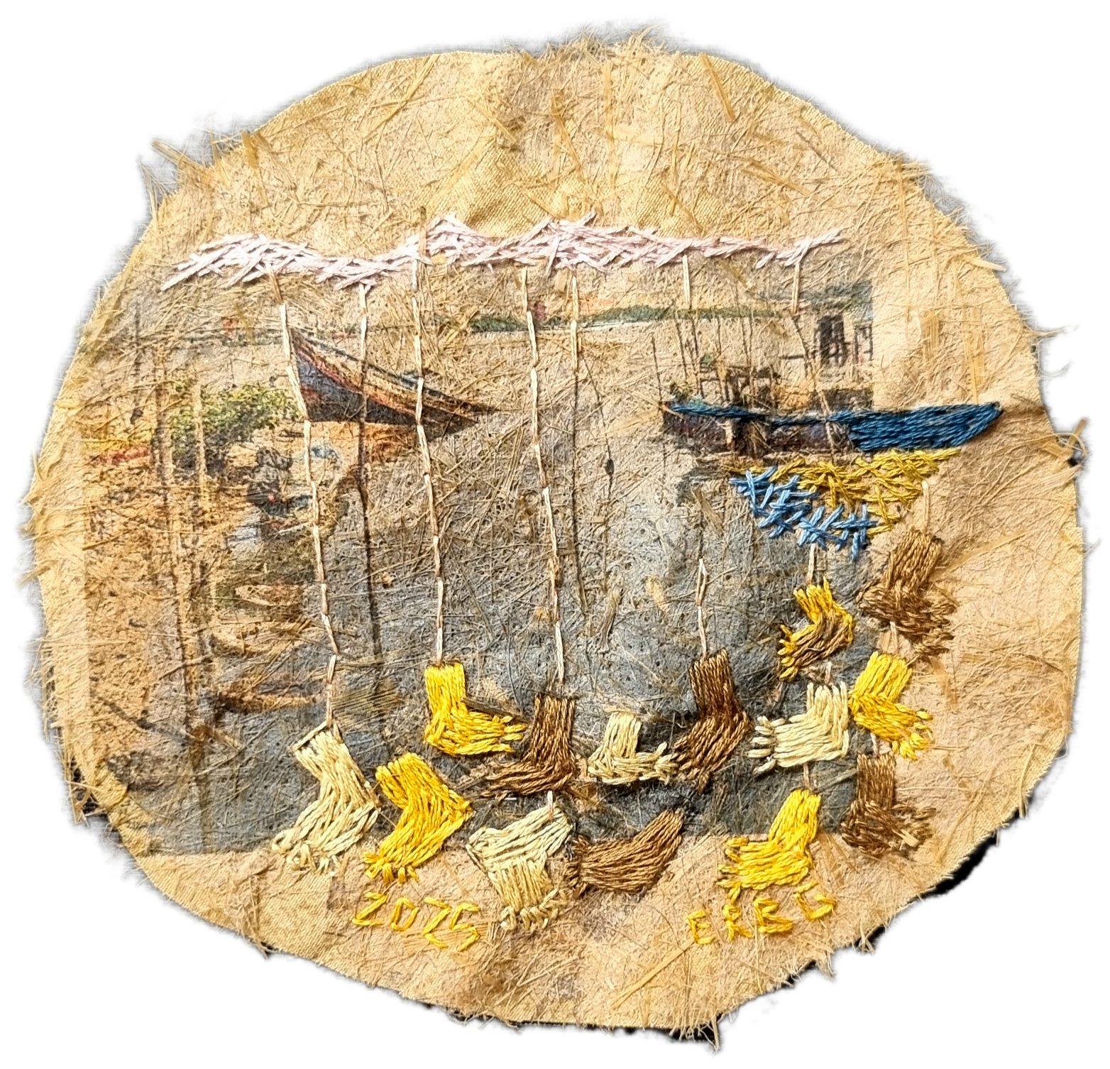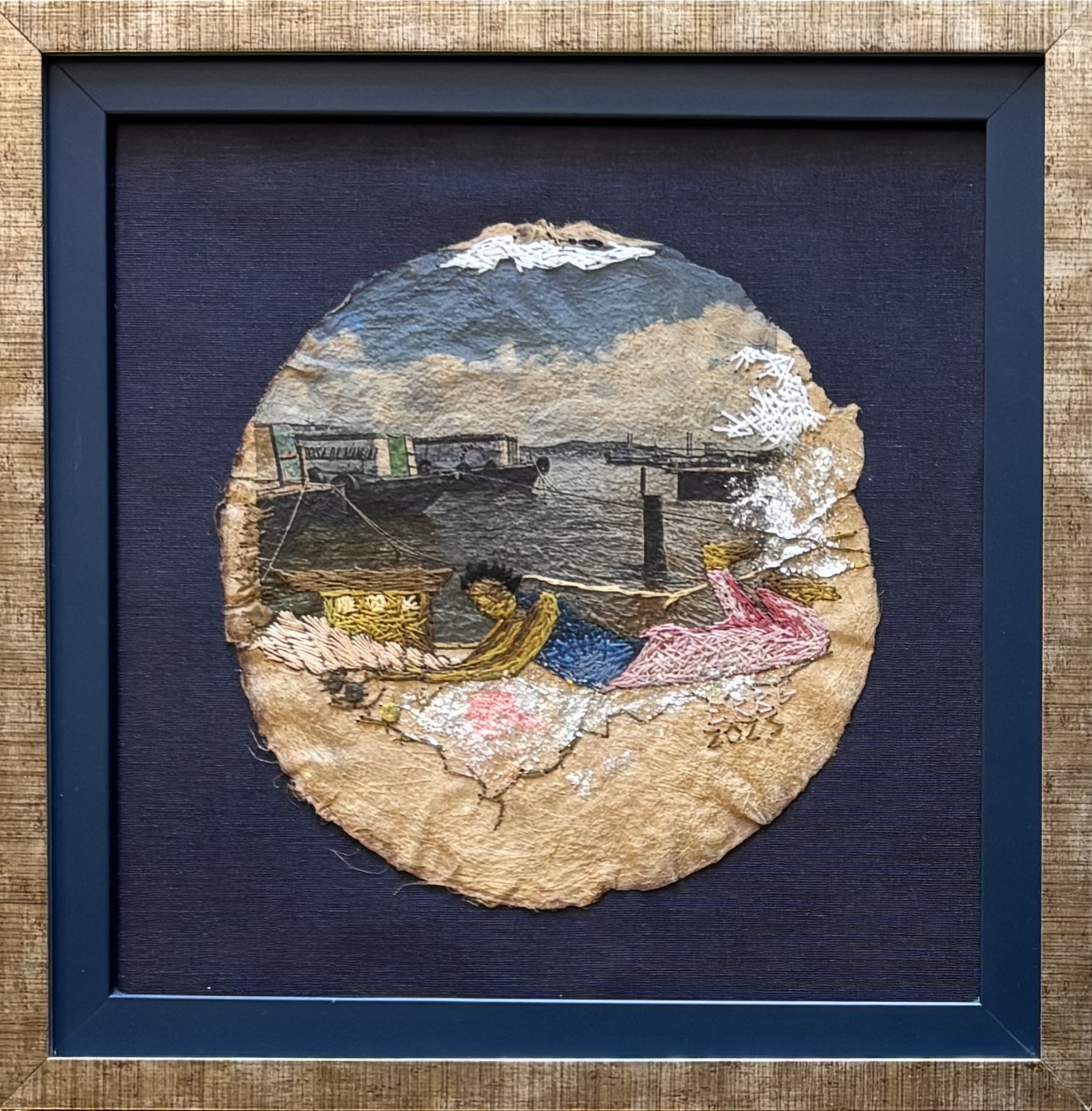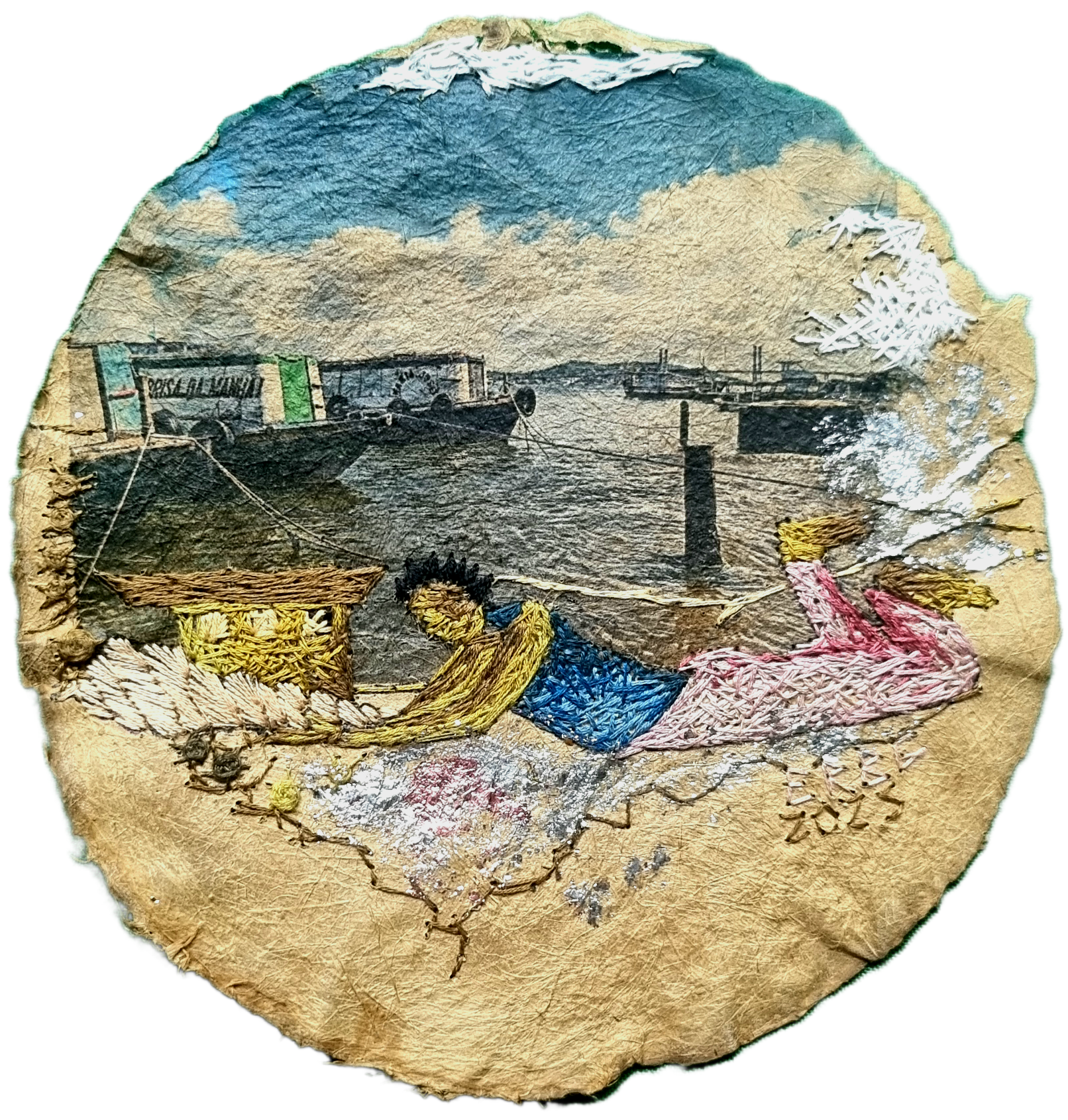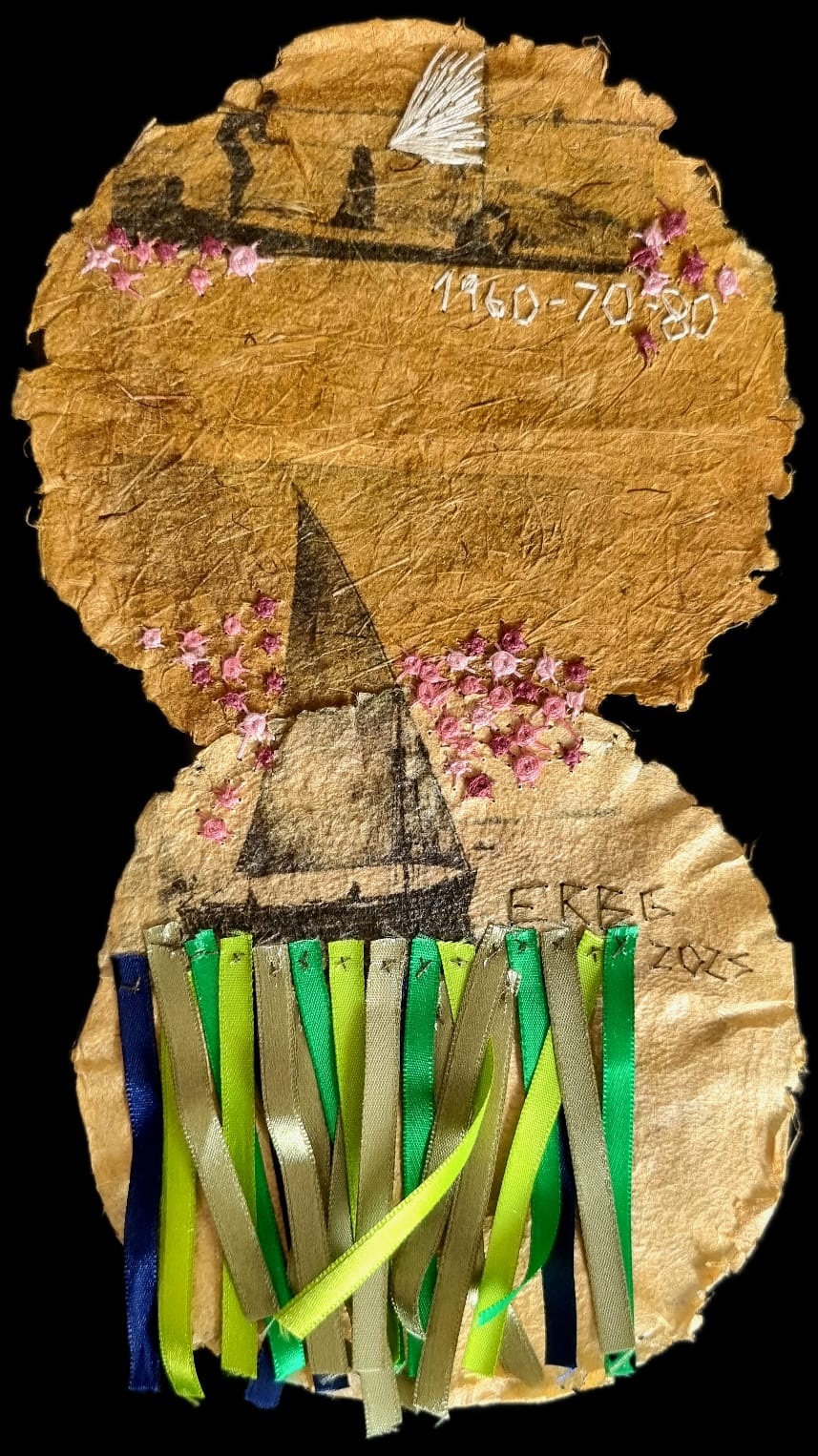 Novelos ao Mar é um conjunto de 27 obras realizadas a partir de pesquisa de imagem sobre as embarcações que navegaram o rio Sergipe. Bordados sobre fotografias de época impressas sobre papéis artesanais. 1855 – 2025.