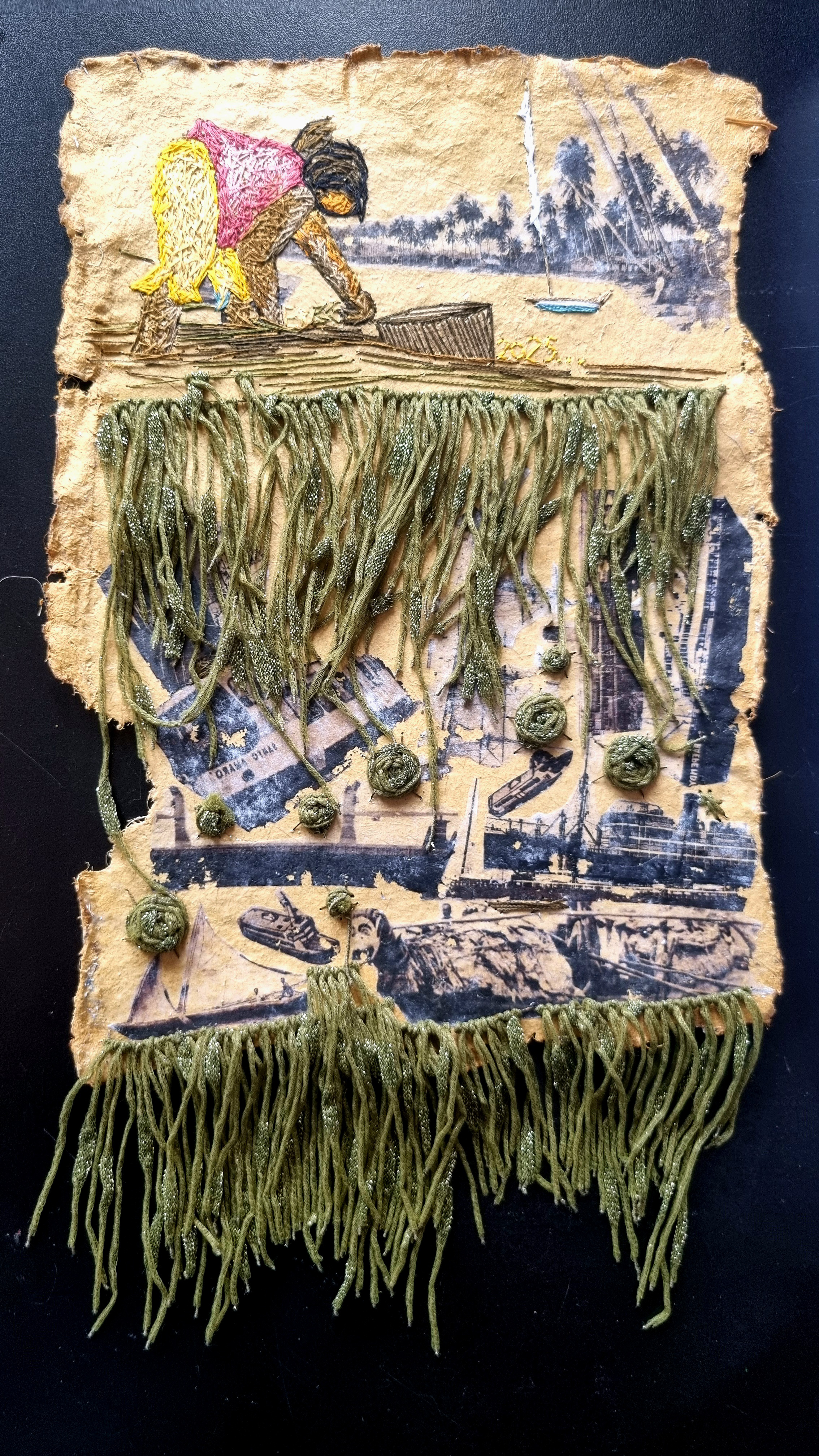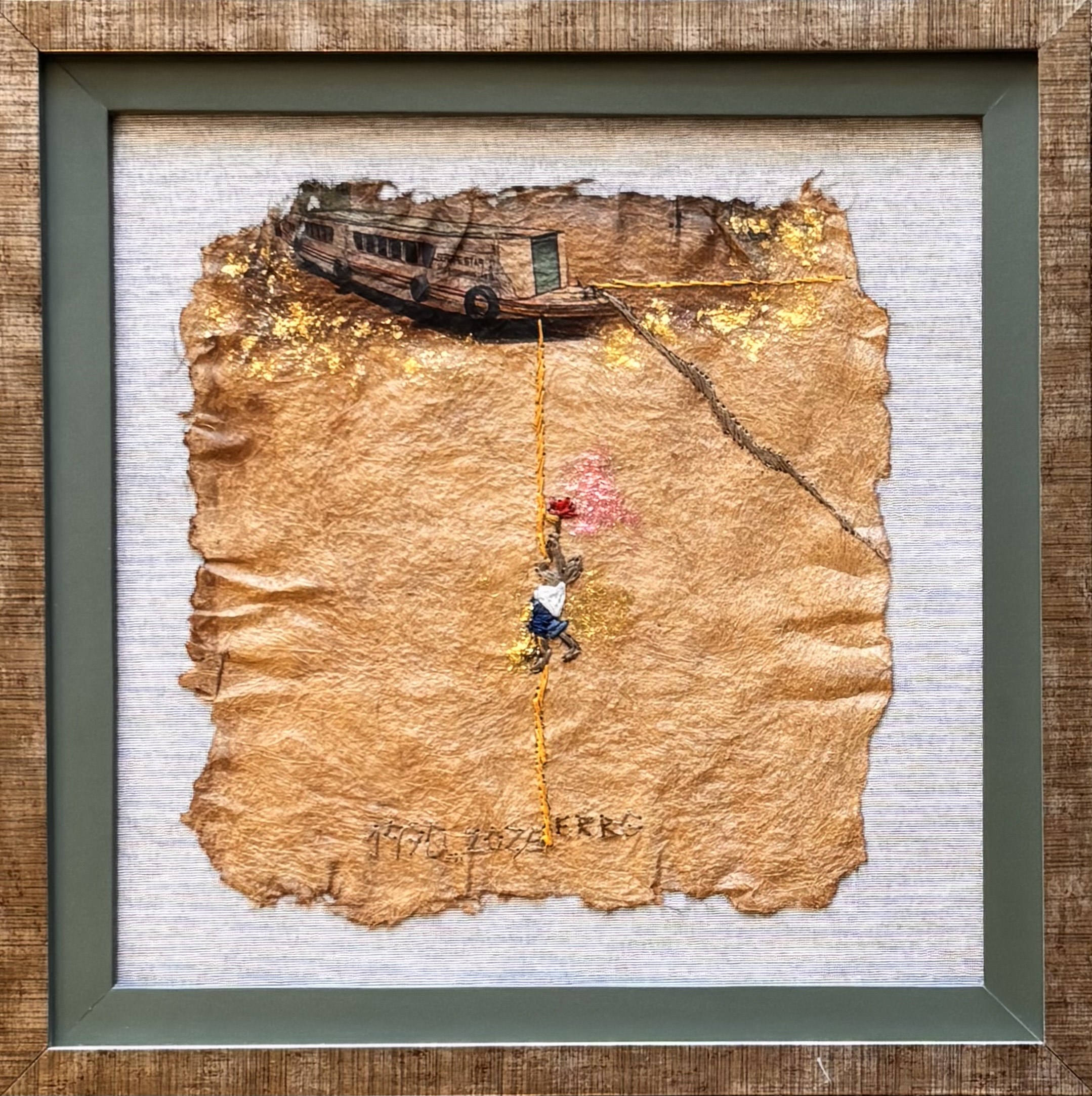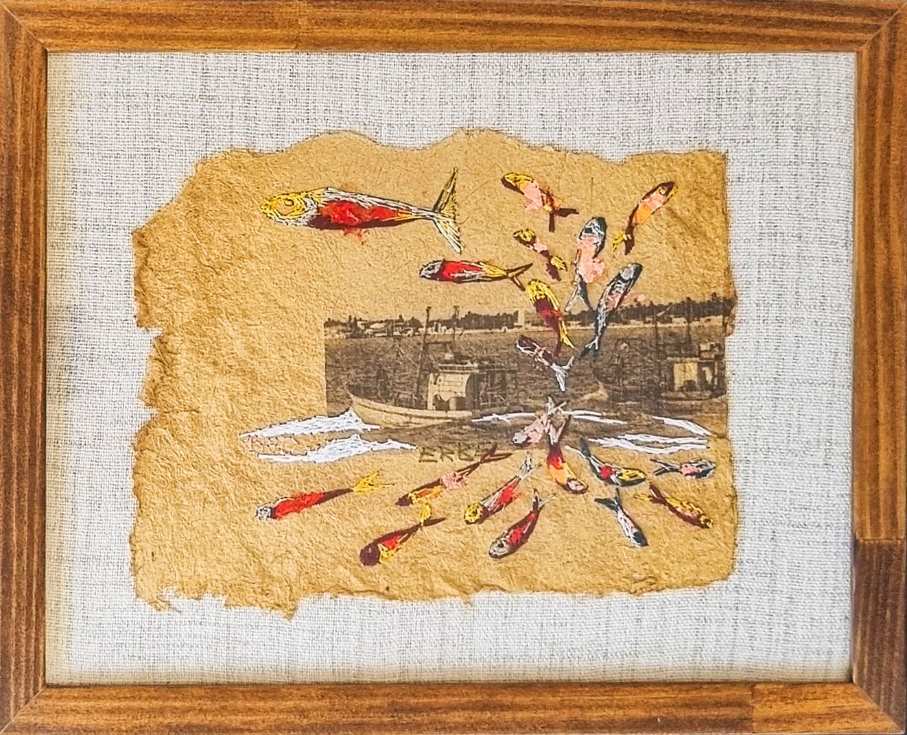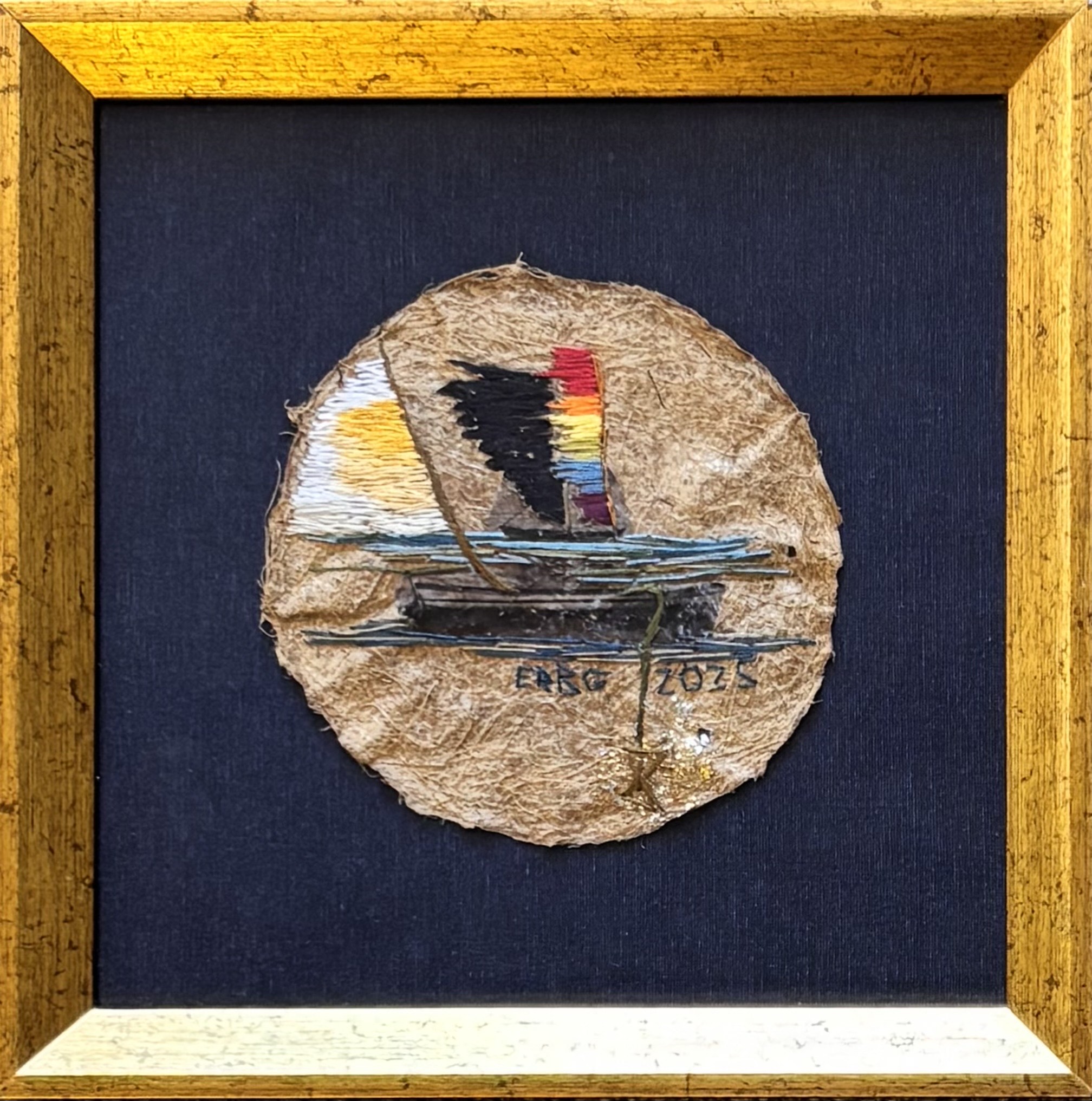 Novelos ao Mar é um conjunto de 27 obras realizadas a partir de pesquisa de imagem sobre as embarcações que navegaram o rio Sergipe. Bordados sobre fotografias de época impressas sobre papéis artesanais. 1855 – 2025.