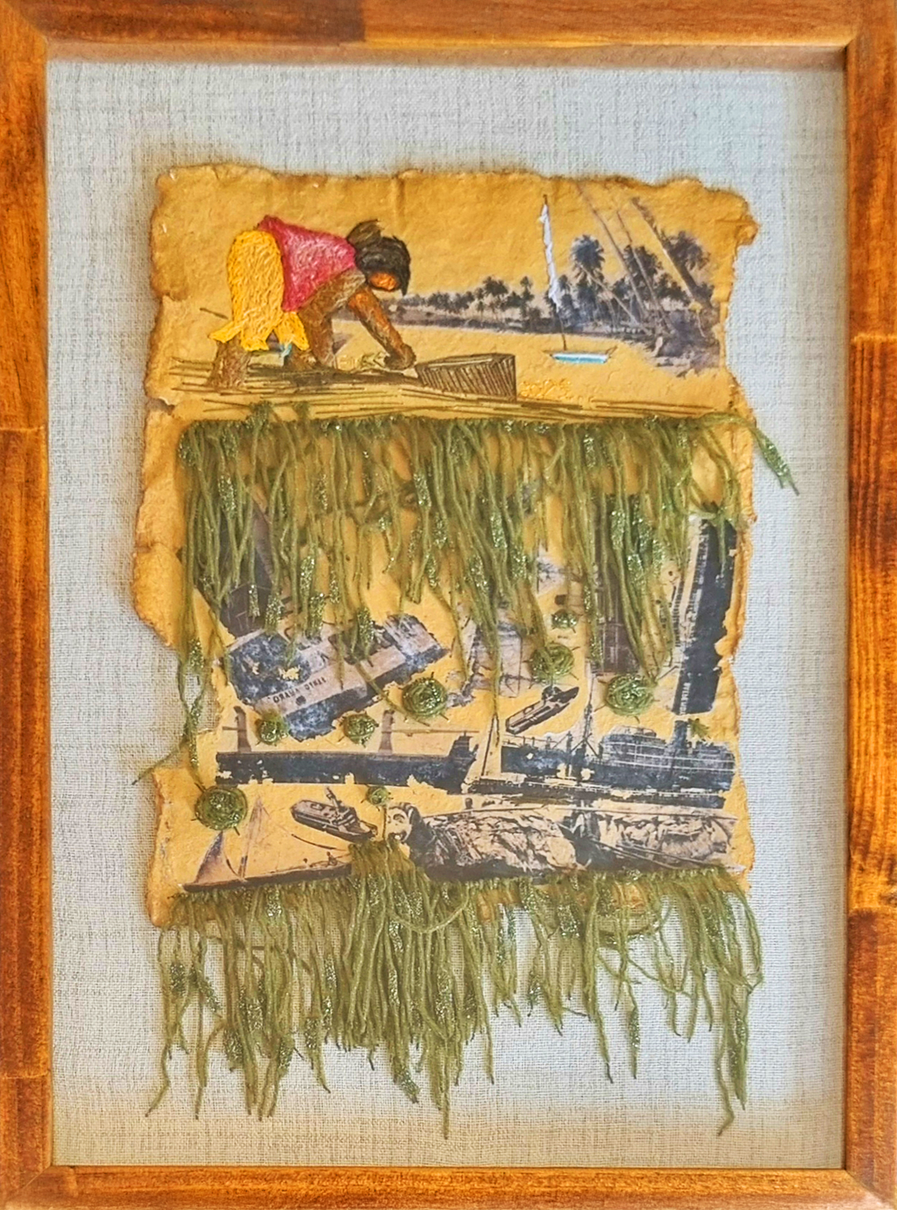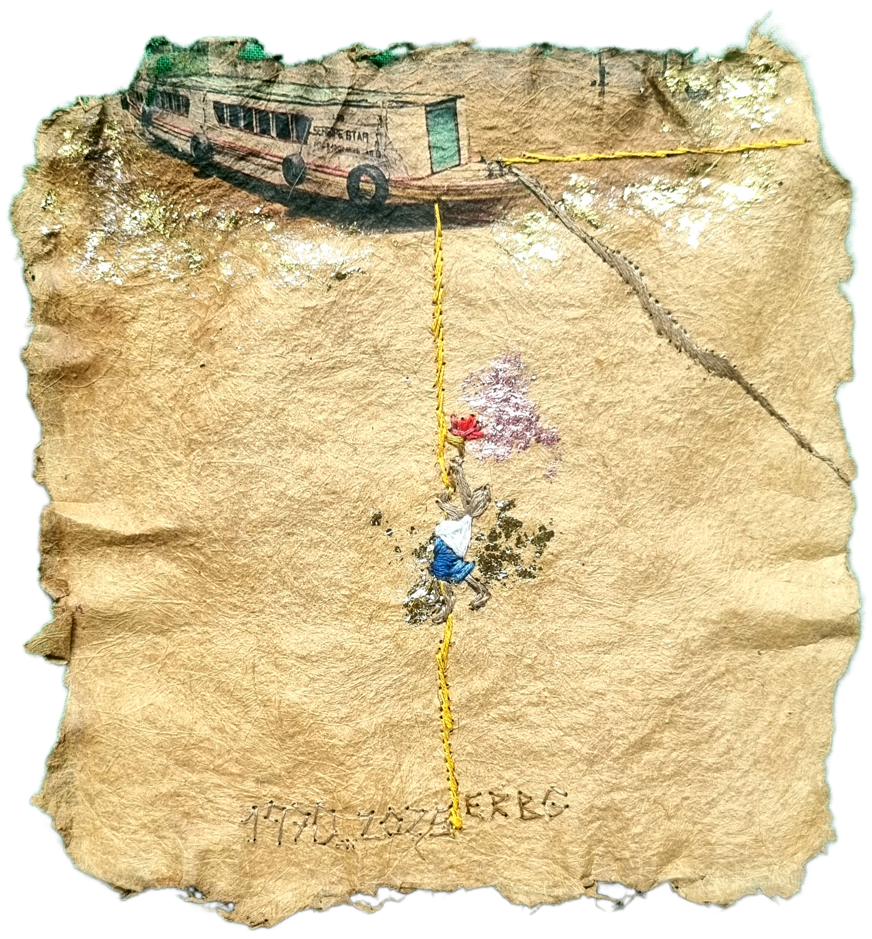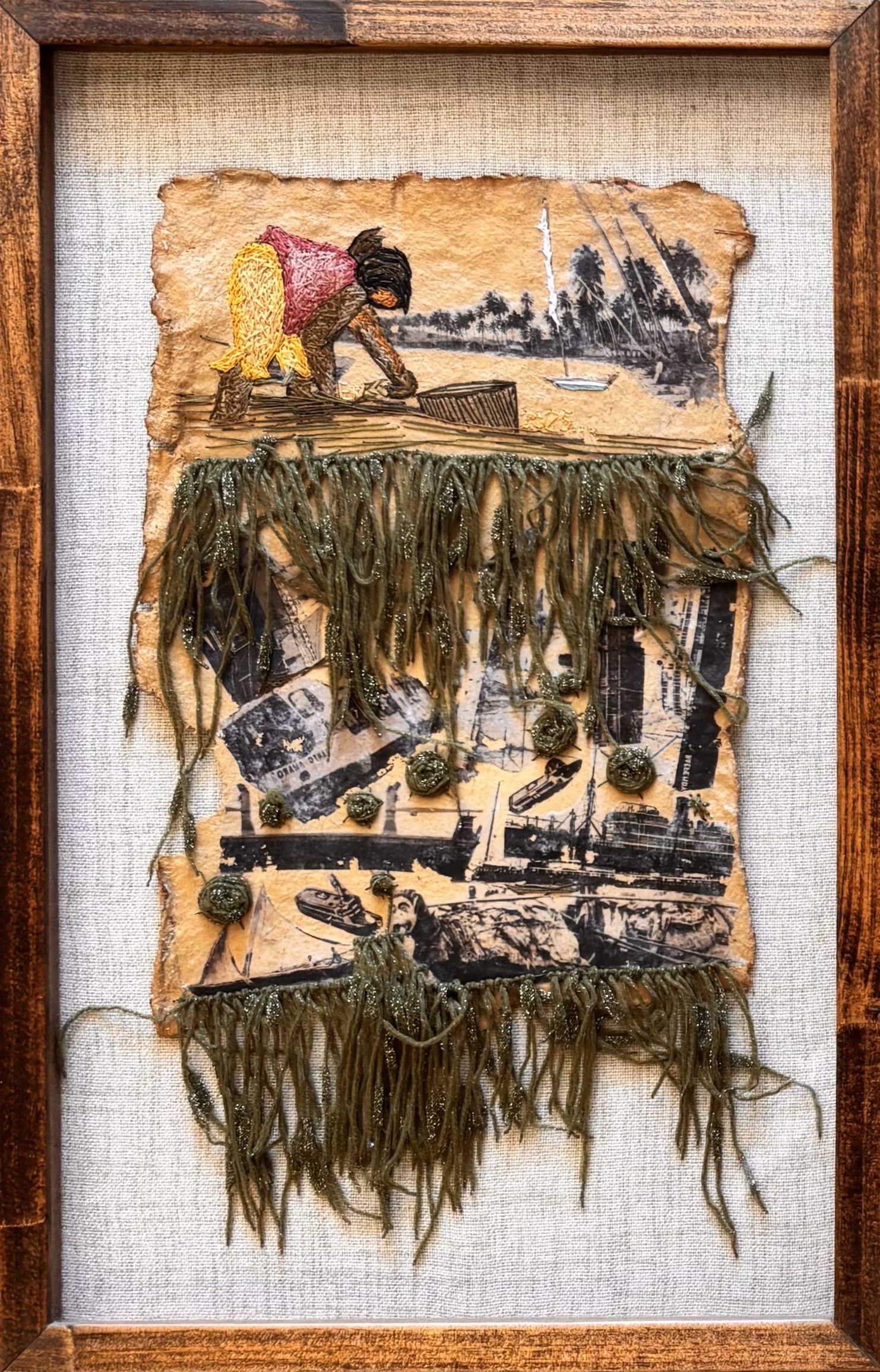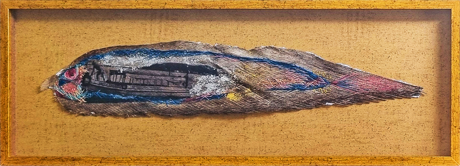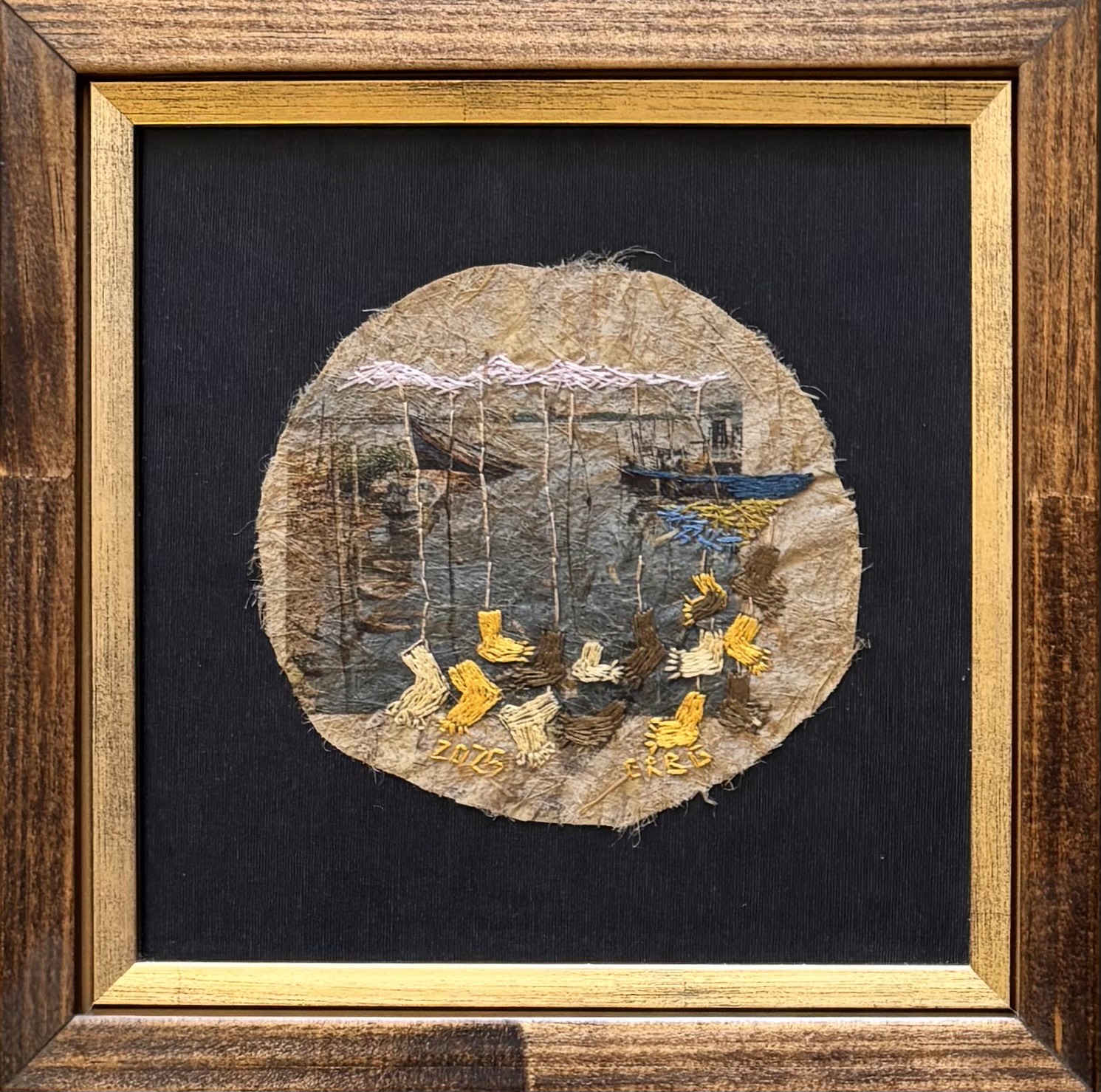 Novelos ao Mar é um conjunto de 27 obras realizadas a partir de pesquisa de imagem sobre as embarcações que navegaram o rio Sergipe. Bordados sobre fotografias de época impressas sobre papéis artesanais. 1855 – 2025.